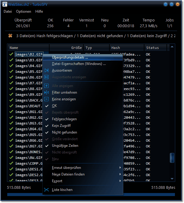 Nur die Dateien, bei denen die Überprüfung aus irgendeinem Grund fehlgeschlagen ist,